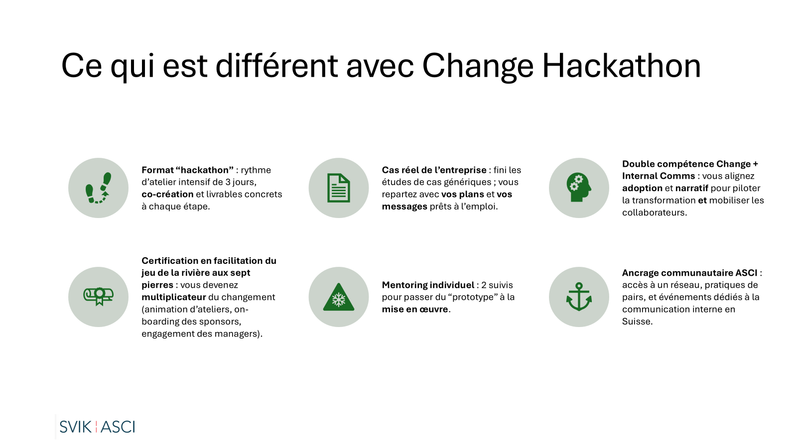 Change hackathon est la formation 100 % pratique qui transforme un cas réel d’entreprise en plan de change et de communication prêt à déployer.